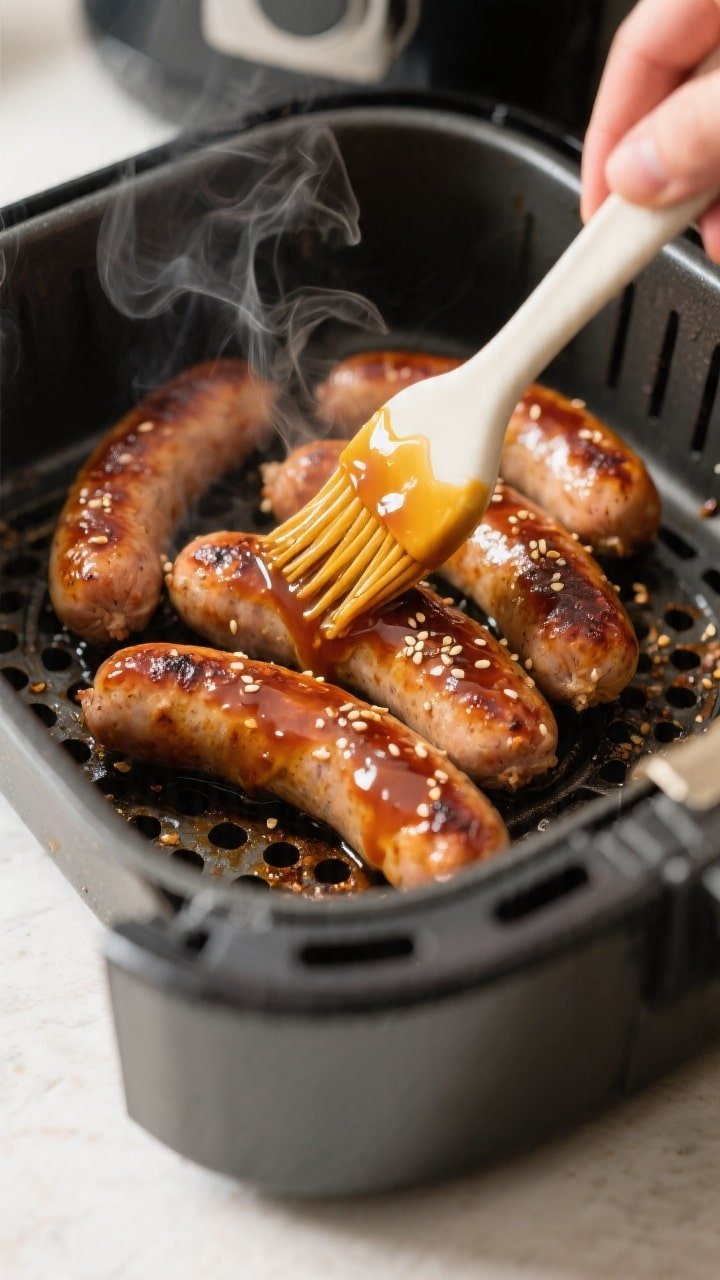 - Sauce and finish: Brush or toss the sausages with the BBQ sauce. Return to the air fryer for 2–4 minutes to set and lightly caramelize the glaze. Keep an eye on them so the sugars don’t burn.