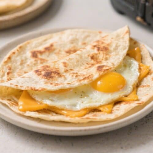 If you love a hot, crispy breakfast that feels special but takes almost no effort, this recipe is for you. A tortilla, melty cheese, and soft scrambled eggs come together in minutes thanks to the air fryer. The edges get golden and crunchy, the center stays cheesy and tender, and the whole thing tastes like a café breakfast wrap—without the fuss.