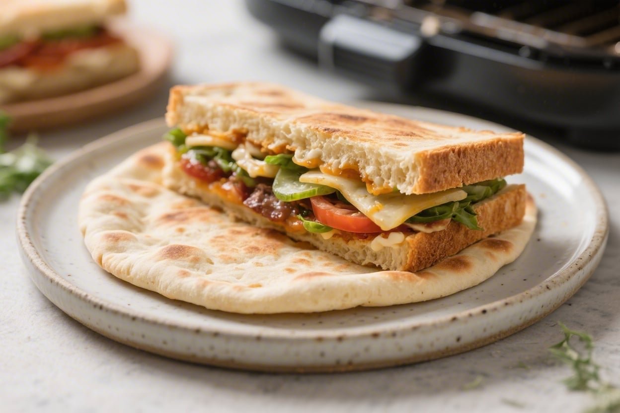 - Air fry: Place the sandwich oiled-side out into the basket. Air fry at 375°F (190°C) for 3–4 minutes, flip, then cook 2–3 minutes more until the bread is crisp and the cheese is melted.