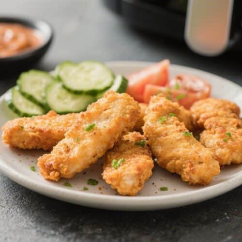 Air fry: Cook at 400°F (200°C) for 8–10 minutes, flipping halfway. Spray the second side lightly after flipping. Tenders are done when golden and the internal temp hits 165°F (74°C).