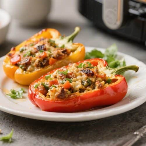 Air fry: Arrange peppers upright in the air fryer basket, leaving space between them for airflow. Cook at 360°F (182°C) for 10–14 minutes, until peppers are tender and the cheese is melted and lightly browned.