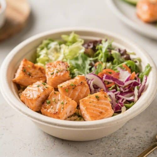 Toss and rest: Add the salmon cubes and gently toss to coat.