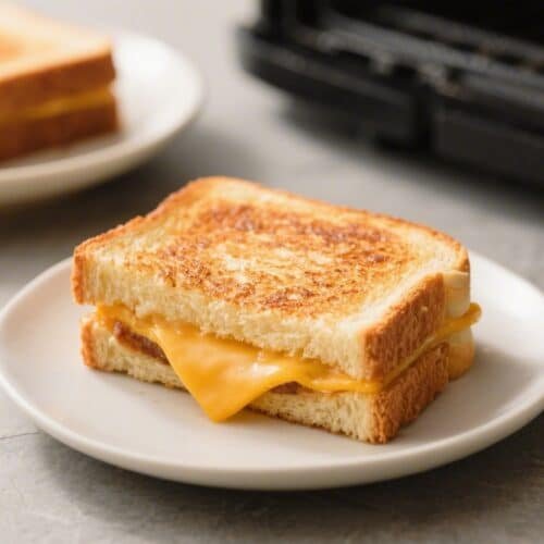 Air fry, side one: Place the sandwich in the basket, buttered side down. Cook for 4–5 minutes. Check at 3 minutes to make sure it’s browning evenly.