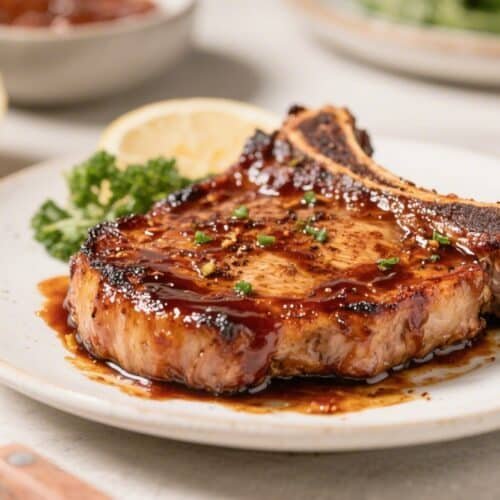 Rest and glaze. Transfer the chops to a plate and rest for 5 minutes. Brush with a little more BBQ sauce for a glossy finish.