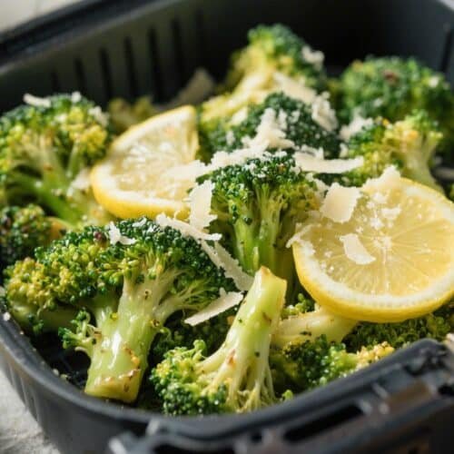 Air fry in a single layer: Arrange broccoli in the basket without cramming. Work in batches if needed. Cook 6–9 minutes, shaking halfway, until the florets are browned and crisp at the tips and the stems are tender.
