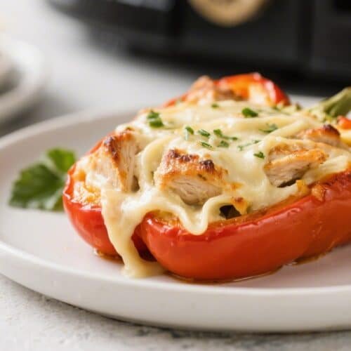 Air fry: Place the stuffed peppers in the air fryer basket, cut side up. Cook at 360°F (182°C) for 10–14 minutes, depending on pepper size and your air fryer model. They’re done when the peppers are tender and the cheese is melted and lightly golden.