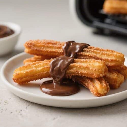 Air fry in batches. Lightly spray the air fryer basket with oil and place churro strips in a single layer, not touching. Mist the tops with a little oil. Air fry at 375°F (190°C) for 8–10 minutes, or until puffed and deep golden. Rotate or shake the basket halfway for even browning.