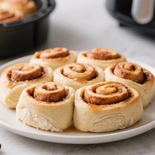 Canned roll method: Place canned rolls on parchment in the basket, spacing them out. Air fry at 330°F for 6–9 minutes, checking at 5. If the tops brown before the centers are set, lower the temp to 300°F and cook 2–3 more minutes. Ice with the included packet or your homemade glaze.