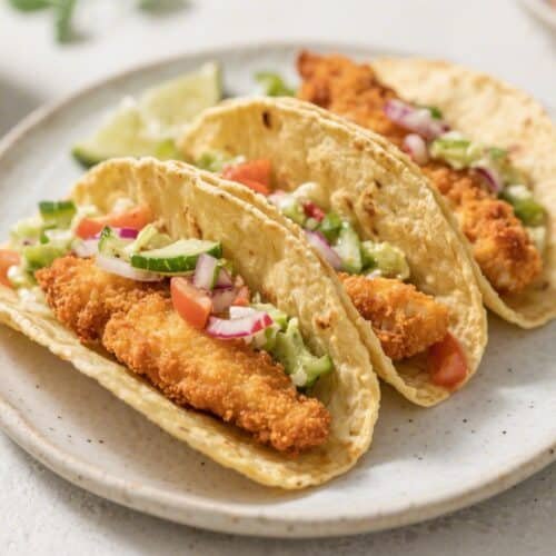 Assemble: Add slaw to each tortilla, top with crispy fish, drizzle with sauce, and finish with avocado, onions, and a squeeze of lime.
