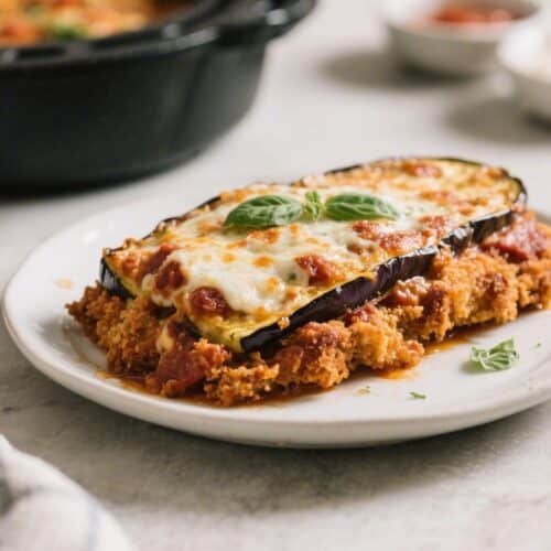 Layer with sauce and cheese: Spread a thin layer of marinara in a baking dish that fits your air fryer (or use an oven-safe tray if your model allows). Add a single layer of crispy eggplant, spoon on marinara, sprinkle mozzarella and some of the remaining Parmesan. Repeat layers as desired, finishing with cheese.