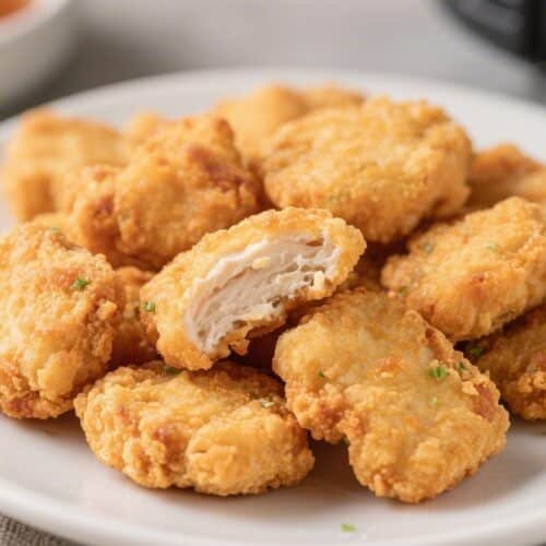 Timing tips: Minis or thin nuggets usually take 7–9 minutes. Larger, thicker, or “whole breast” nuggets may need 10–12 minutes. Different brands vary, so use color and texture as your guide.