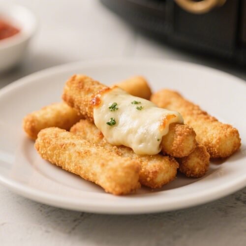 Air fry for 5–7 minutes. Start checking at 5 minutes. They’re done when the coating is golden and you see the very first sign of softening at the ends. Avoid overcooking or cheese will burst out.