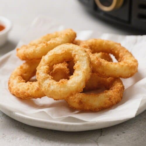 Air fry for 8–12 minutes, shaking the basket halfway. Start checking at the 7–8 minute mark. Thin rings cook faster; thick, beer-battered rings may need the full 12 minutes.