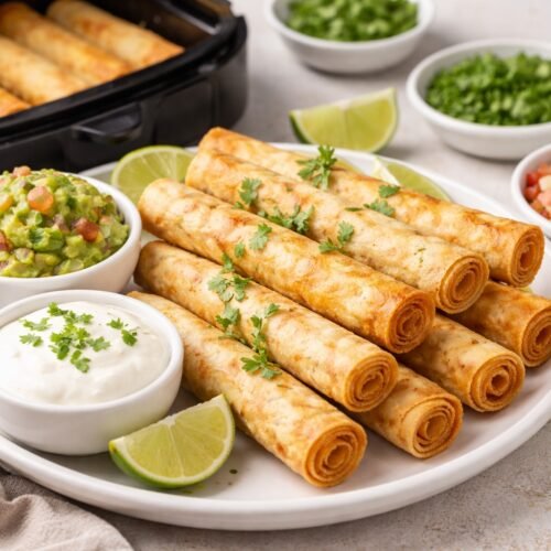 Serve with toppings like salsa, guac, and a squeeze of lime. Add shredded lettuce and cheese to make it a quick taquito platter.