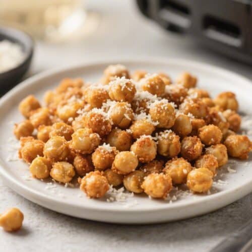 Air fry in a single layer. Lightly spray the basket, add the chickpeas, and spread them out. Cook for 10–12 minutes, shaking the basket halfway. They should be golden and starting to crisp.