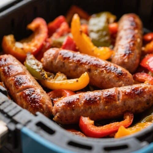 Air fry the first side. Cook for 8–10 minutes at 380°F. The sausages should start to brown and the peppers should soften.