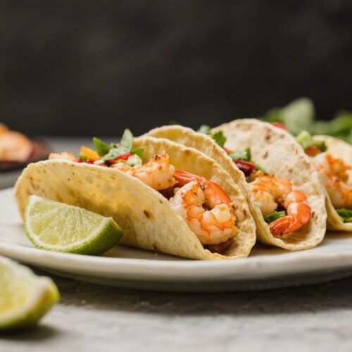 Assemble: Add a little slaw to each tortilla, top with shrimp, drizzle with sauce, and finish with cilantro, avocado, pickled onions, and a squeeze of lime.