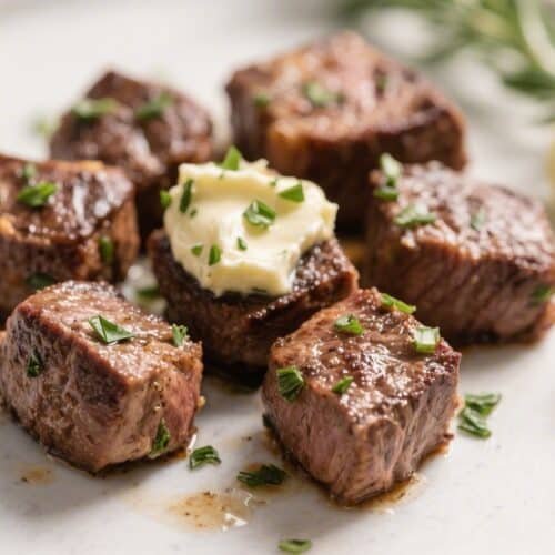 Toss with butter. Transfer hot steak bites to a bowl and immediately toss with the garlic herb butter so it melts and coats every piece.
