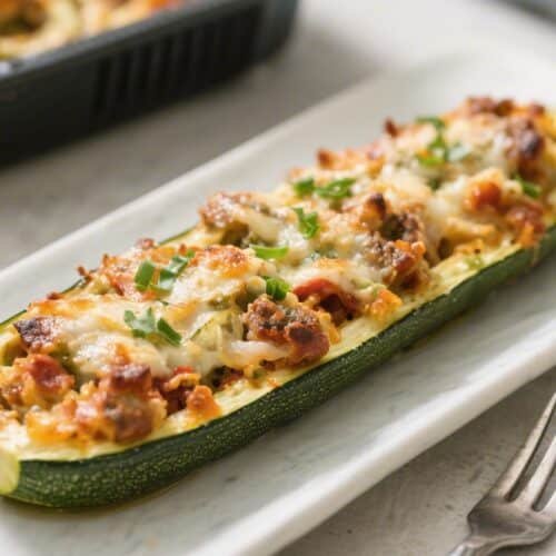 Air fry in batches if needed: Arrange stuffed zucchini in the air fryer basket in a single layer. Cook at 375°F (190°C) for 10–12 minutes, until the zucchini is tender when pierced and the cheese is golden and bubbly.