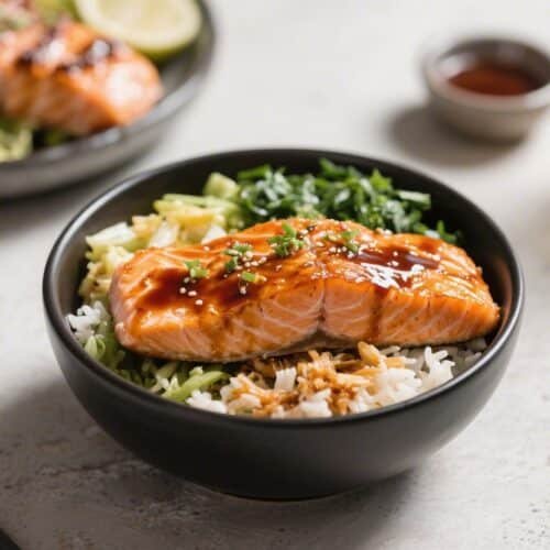 Build the bowls: Add a scoop of warm rice to each bowl. Top with salmon. Spoon extra teriyaki over the fish and rice. Add veggies and avocado around the sides.