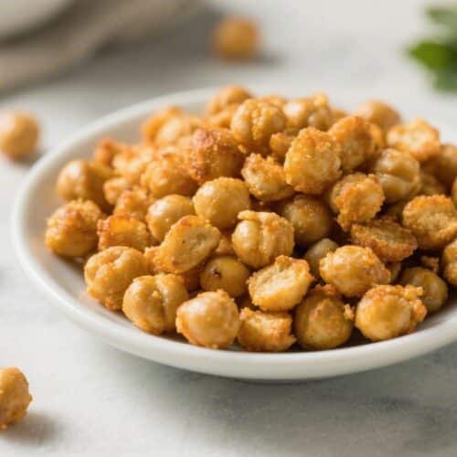 Air fry the chickpeas. Add to the basket in a single layer. Cook for 12–16 minutes, shaking the basket every 4–5 minutes. They’re done when golden and crisp to the bite. Thicker chickpeas may need an extra minute or two.