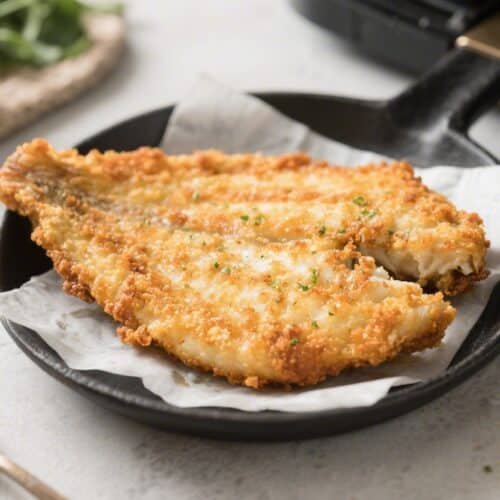 Flounder is thin, so it cooks fast. It’s done when the crust is golden and the fish flakes easily with a fork.