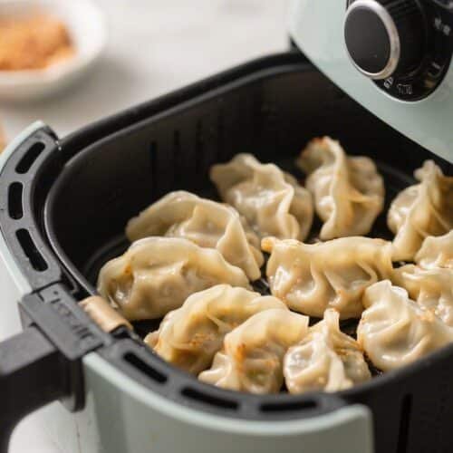 Preheat the air fryer to 370–380°F (188–193°C) for 3–5 minutes. Preheating helps the dumplings crisp evenly from the start. If your air fryer runs hot, use the lower end of the range.